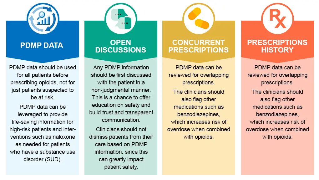 CDC’s Clinical Practice Guideline has identified recommendations for clinicians using PDMPs, which can be incorporated into treatment best practices, and key considerations are as follows:1